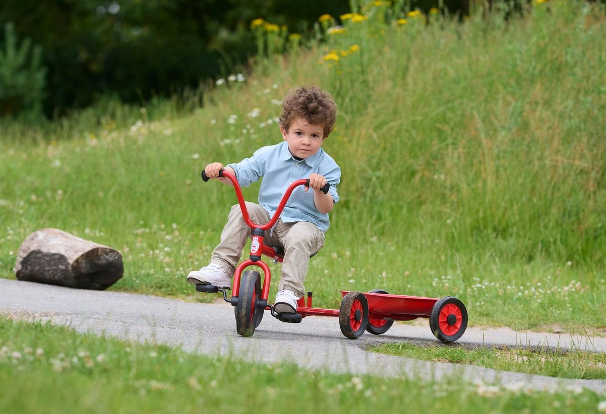 Mit dem Dreirad "Taxi" lassen sich Freunde und Freundinnen ganz bequem chauffieren. Zwei Sitze sind hintereinander angebracht und ein Antirutschbrett gibt einem dritten Passagier einen sicheren Stand. Eine Rückenlehne an den beiden Sitzen sorgt für besonderen Komfort.Details:⦁ Lenkeinschlag und Anschlagdämpfer für mehr Sicherheit⦁ Robuster, pulverbeschichteter Rahmen für höchste Stabilität und stoßfeste Lackierung⦁ Lange wetterfeste Kunststoffsitze-passend für verschiedene Altersgruppen⦁ Räder mit geschlossenem, dauergeschmierten Industriekugellager für leichtes Fahren⦁ Speichenlose Räder⦁ Hochwertige, massive Achse aus gehärtetem Stahl⦁ Starker Metallrahmen mit 22 mm Durchmesser⦁ Spezialpedale mit Gumminoppen verhindert ein Abrutschen der Füße⦁ Durchgeschäumte EVA-Reifen für lange Lebensdauer und leises Fahren⦁ Robuste Handgriffe mit verstärkter Kappe und Gumminoppen für soliden Halt⦁ Wissenschaftlich getestet⦁ Entwickelt mit einem Team aus führenden Pädagogen, Ingenieuren und Produktdesignern⦁ 5 Jahre Garantie auf den Rahmen⦁ 1 Jahr Garantie auf alle beweglichen Teile⦁ Umfassender Ersatzteil-Service⦁ Geprüft nach EN 71Lenkerhöhe: 64 cmSitzhöhe: 38 cmLänge: 112 cmBreite: 56Lenkerbreite: 46 cmGewicht: 12,5 kgAltersempfehlung: ab 3 Jahre Umfassender Ersatzteilservice
