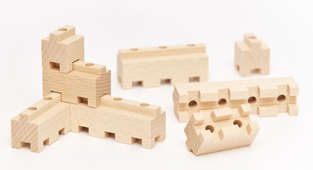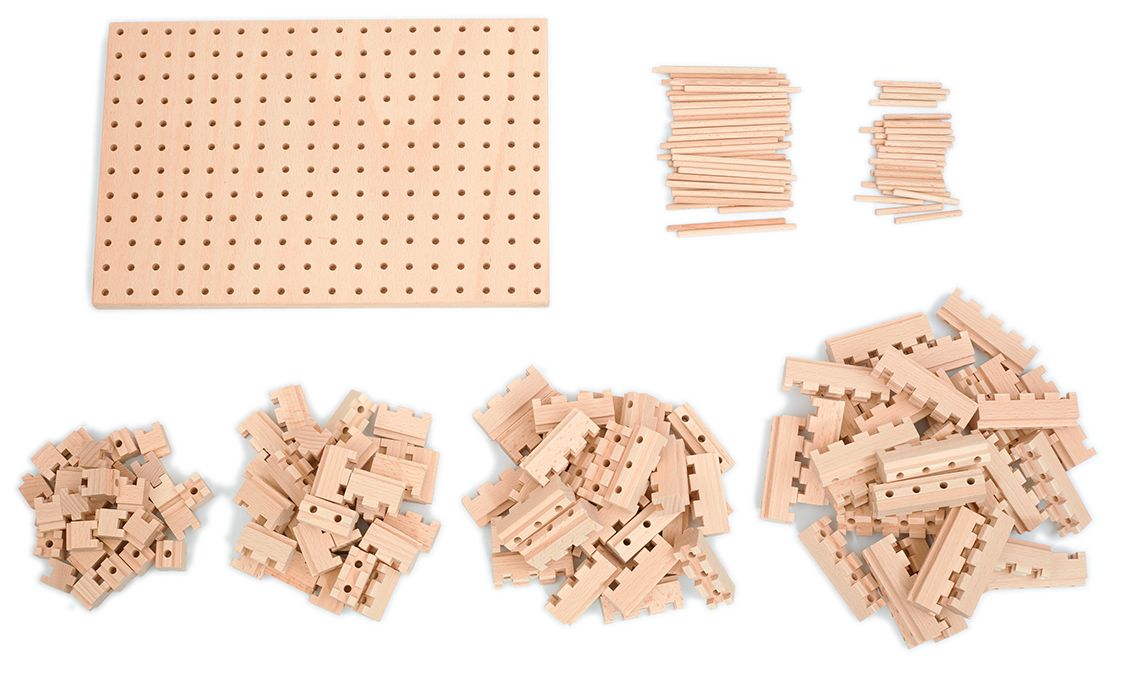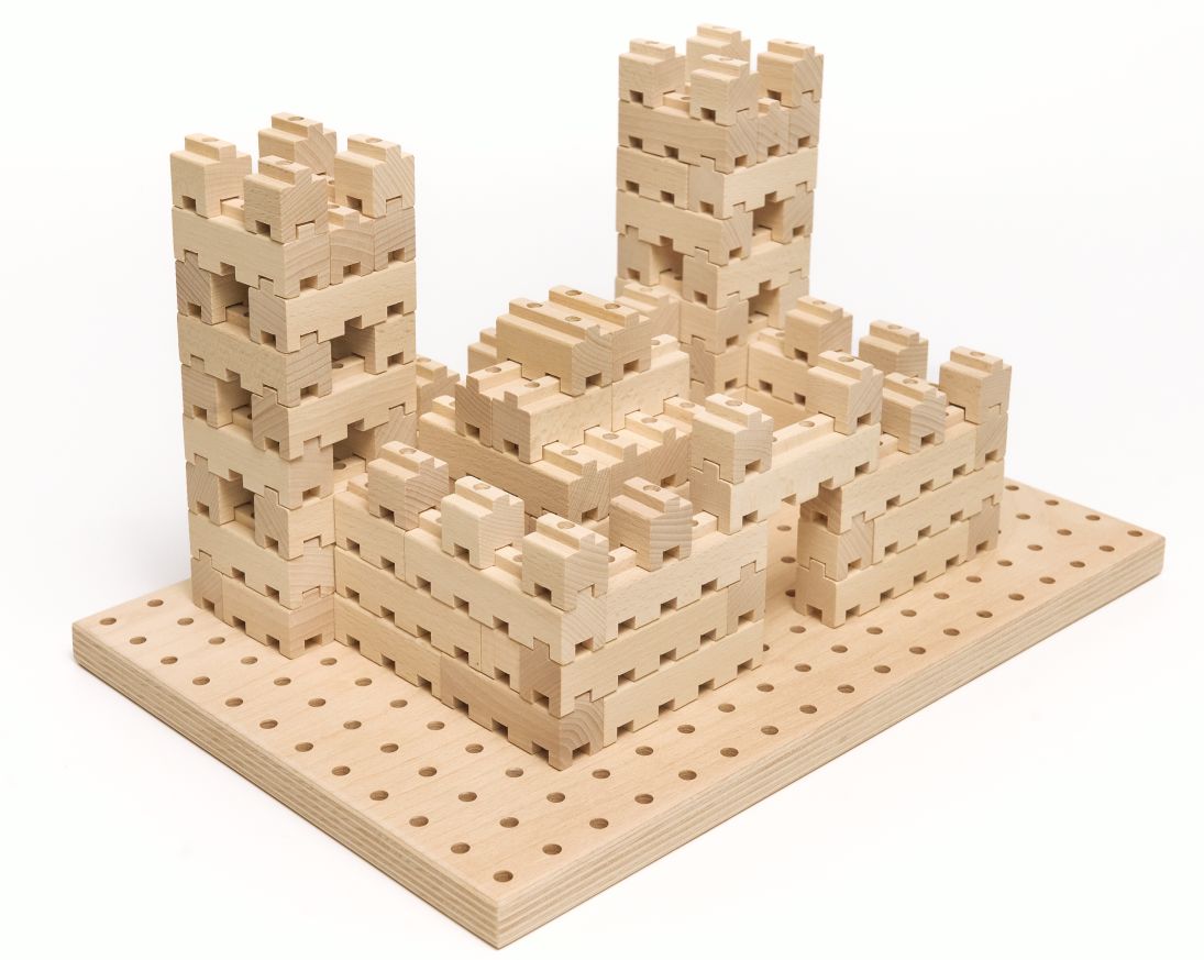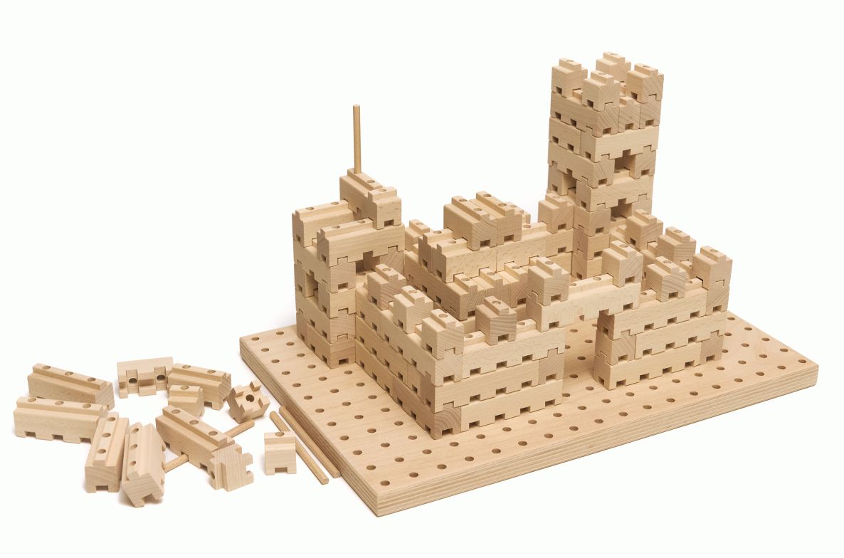 Aus 191 Bausteinen in vier Größen können Kinder beeindruckende Bauwerke konstruieren