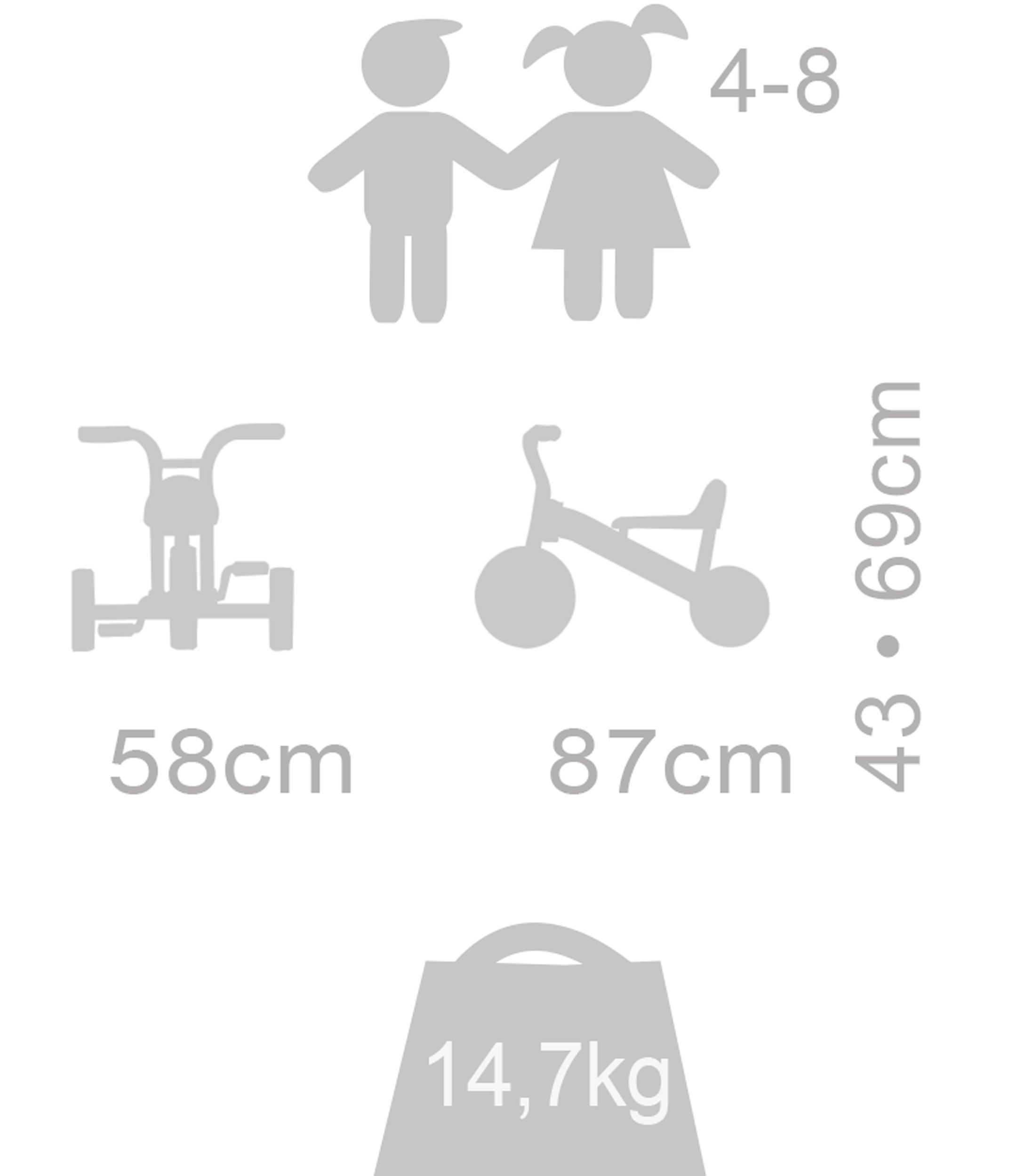 Alter 4-8 Jahre, Sitzhöhe 43 cm, Breite 58 cm, Länge 87 cm, Lenkerhöhe 69 cm, Gewicht 14,4 kg.