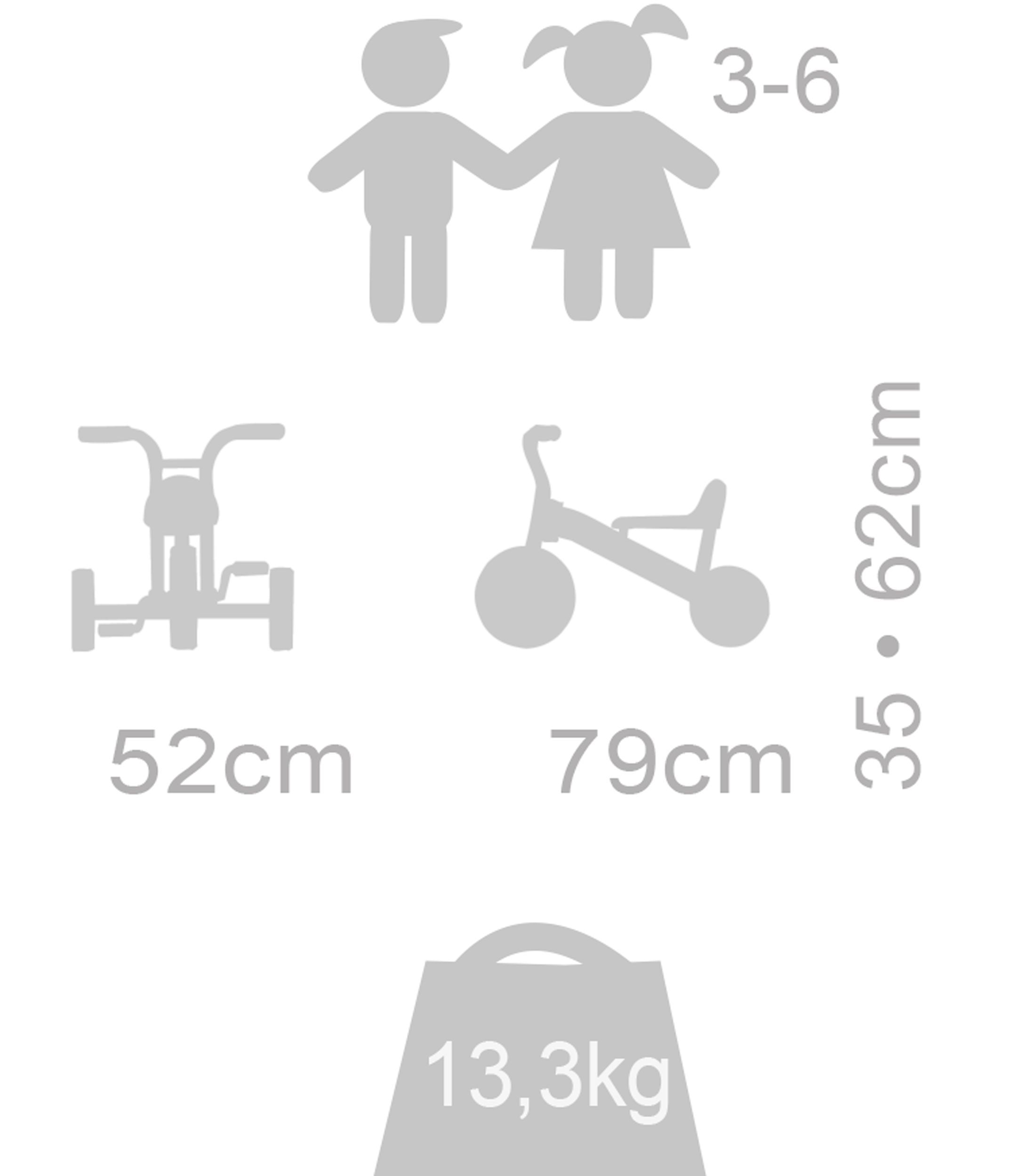 Alter 3-6 Jahre, Sitzhöhe 35 cm, Breite 52 cm, Länge 79 cm, Lenkerhöhe 62 cm, Gewicht 13,3 kg.