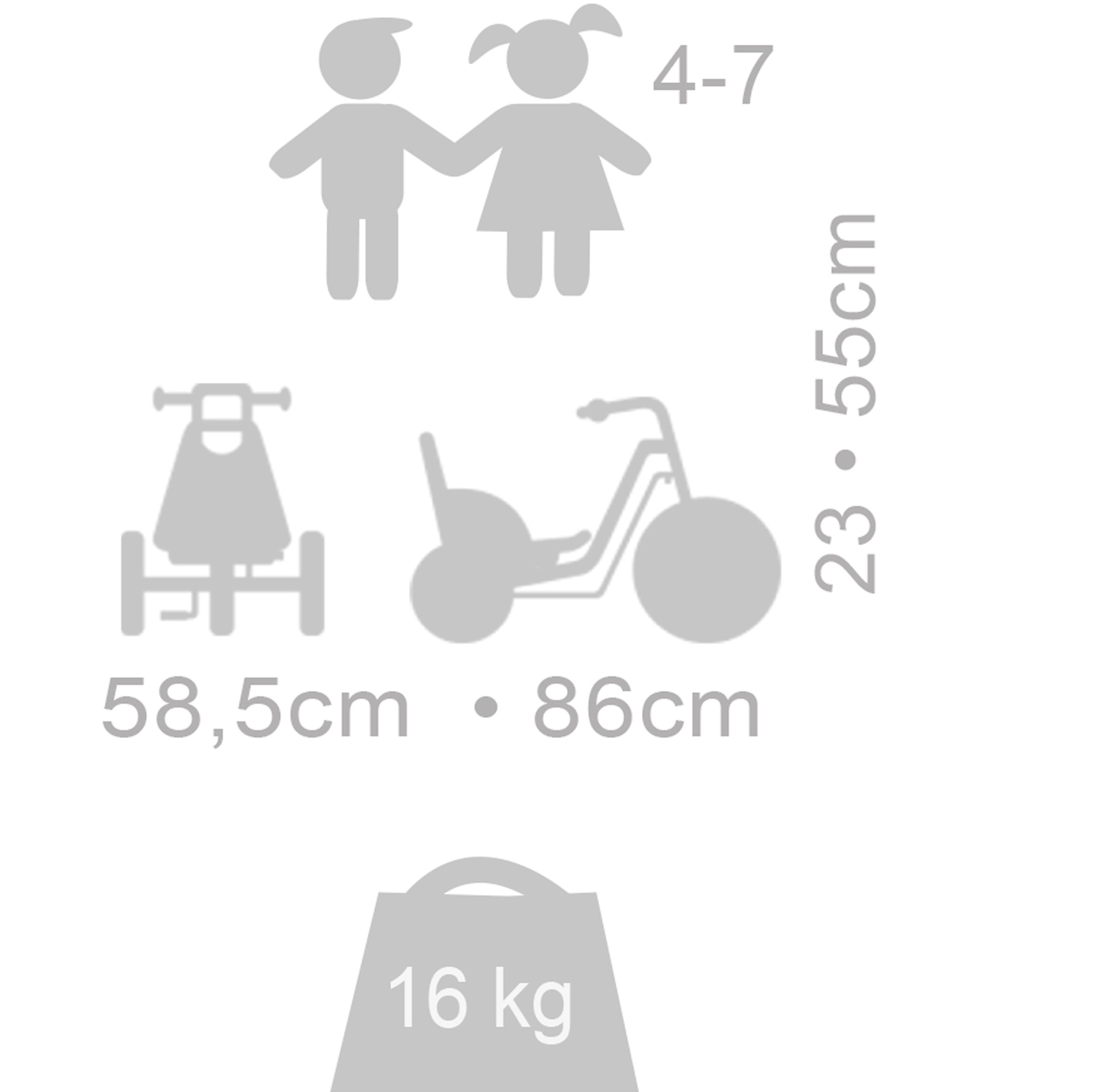 Entspannt cruisen! Dieses tolle Gefährt bietet ein besonderes Fahrgefühl dank seines tiefen Sitzes mit Lehne und der hohen Lenkvorrichtung. Der Sitz lässt sich je nach Kindergröße passend verstellen.Details:⦁ Verstellbarer Sitz⦁ Lenkeinschlag und Anschlagdämpfer für mehr Sicherheit⦁ Robuster, pulverbeschichteter Rahmen für höchste Stabilität und stoßfeste Lackierung⦁ Lange wetterfeste Kunststoffsitze-passend für verschiedene Altersgruppen⦁ Räder mit geschlossenem, dauergeschmierten Industriekugellager für leichtes Fahren⦁ Speichenlose Räder⦁ Hochwertige, massive Achse aus gehärtetem Stahl⦁ Starker Metallrahmen mit 22 mm Durchmesser⦁ Spezialpedale mit Gumminoppen verhindert ein Abrutschen der Füße⦁ Durchgeschäumte EVA-Reifen für lange Lebensdauer und leises Fahren⦁ Robuste Handgriffe mit verstärkter Kappe und Gumminoppen für soliden Halt⦁ Wissenschaftlich getestet⦁ Entwickelt mit einem Team aus führenden Pädagogen, Ingenieuren und Produktdesignern⦁ 5 Jahre Garantie auf den Rahmen⦁ 1 Jahr Garantie auf alle beweglichen Teile⦁ Umfassender Ersatzteil-Service⦁ Geprüft nach EN 71Lenkerhöhe: 66 cmSitzhöhe: 17 cmLänge: 96 cmBreite: 59Lenkerbreite: 48 cmGewicht: 11,0 kgAltersempfehlung: ab 4 Jahre Umfassender Ersatzteilservice