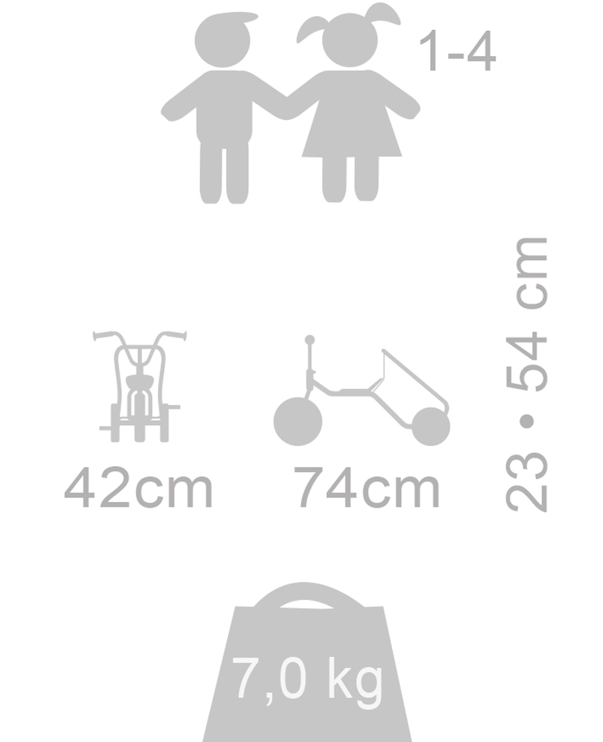 Seite an Seite mit dem Dreirad genießen! Das Dreirad "Seitenwagen" eignet sich für zwei Kinder. Der Mitfahrer kann zudem die Aussicht nach vorn genießen.Details:⦁ Lenkeinschlag und Anschlagdämpfer für mehr Sicherheit⦁ Robuster, pulverbeschichteter Rahmen für höchste Stabilität und stoßfeste Lackierung⦁ Lange wetterfeste Kunststoffsitze-passend für verschiedene Altersgruppen⦁ Seitenwagen mit Sitzschale ⦁ Räder mit geschlossenem, dauergeschmierten Industriekugellager für leichtes Fahren⦁ Speichenlose Räder⦁ Hochwertige, massive Achse aus gehärtetem Stahl⦁ Starker Metallrahmen mit 22 mm Durchmesser⦁ Spezialpedale mit Gumminoppen verhindert ein Abrutschen der Füße⦁ Durchgeschäumte EVA-Reifen für lange Lebensdauer und leises Fahren⦁ Robuste Handgriffe mit verstärkter Kappe und Gumminoppen für soliden Halt⦁ Wissenschaftlich getestet⦁ Entwickelt mit einem Team aus führenden Pädagogen, Ingenieuren und Produktdesignern⦁ 5 Jahre Garantie auf den Rahmen⦁ 1 Jahr Garantie auf alle beweglichen Teile⦁ Umfassender Ersatzteil-Service⦁ Geprüft nach EN 71Lenkerhöhe: 64 cmSitzhöhe: 43 cmLänge: 91 cmBreite: 80Lenkerbreite: 46 cmGewicht: 15,0 kg