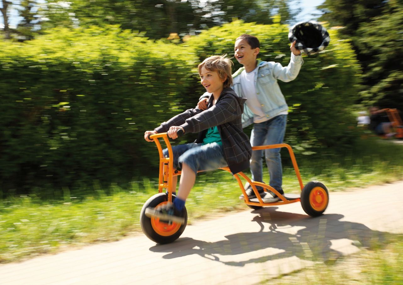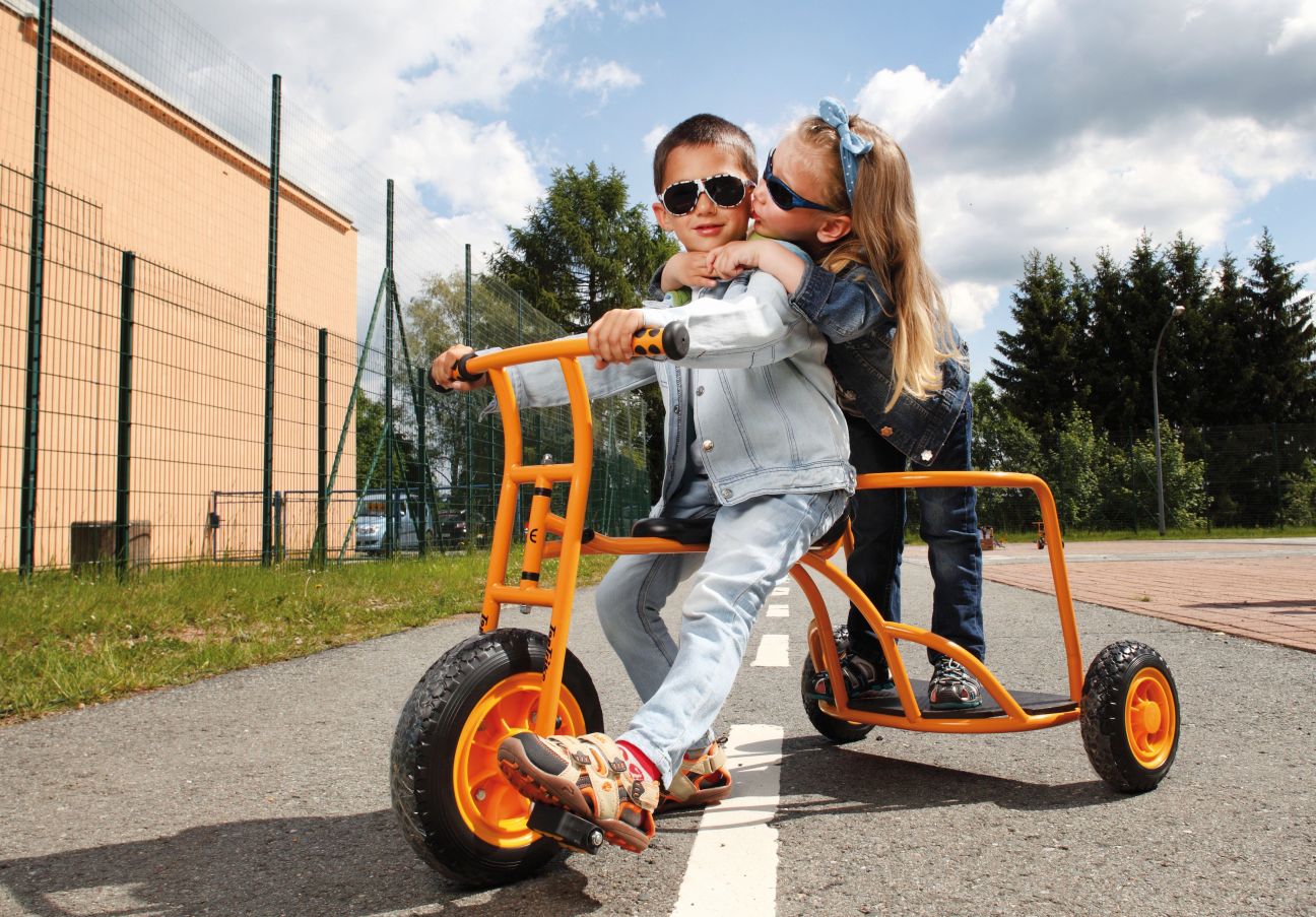 Sich einmal wie ein Römer bei einem Wagenrennen fühlen. Das Dreirad "Express" bietet Fahrspaß für zwei Kinder. Es findet sowohl ein Fahrer als auch ein Mitfahrer stehend darauf Platz. Ein Antirutschbrett und eine Brüstung sorgen für einen sicheren Stand des Mitfahrers. Dieses Fahrzeug bietet diverse Möglichkeiten des Rollenspiels.