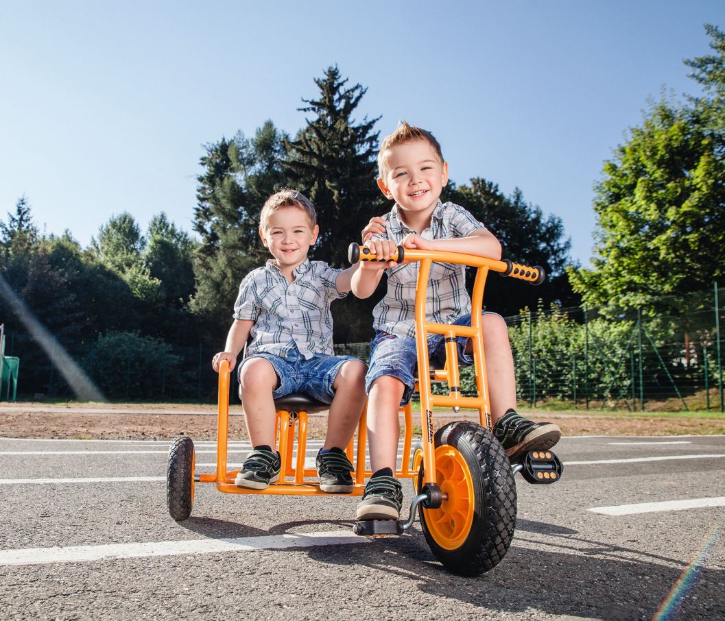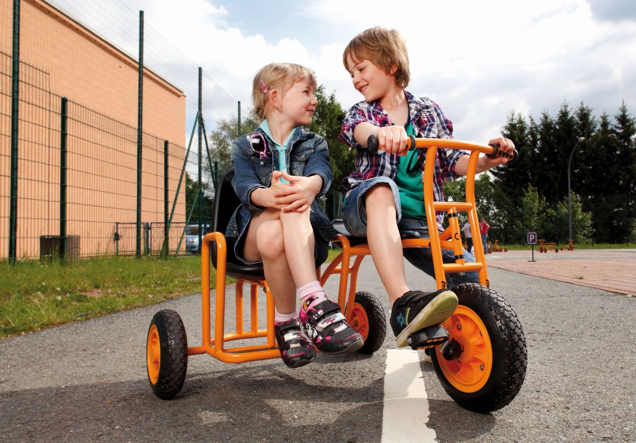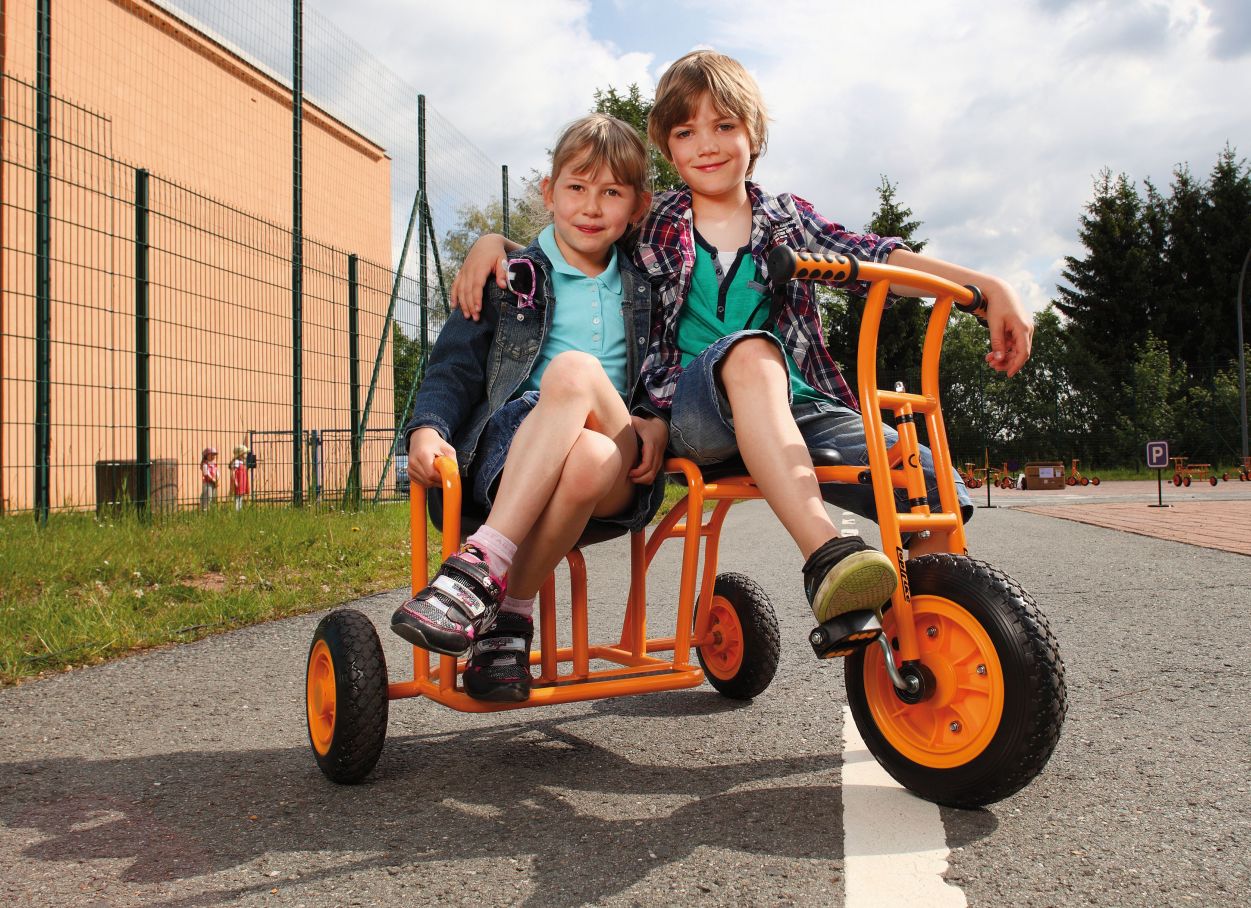 Seite an Seite mit dem Dreirad genießen! Das Dreirad "Seitenwagen" eignet sich für zwei Kinder. Der Mitfahrer kann zudem die Aussicht nach vorn genießen.