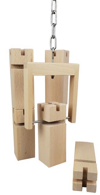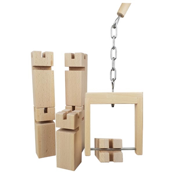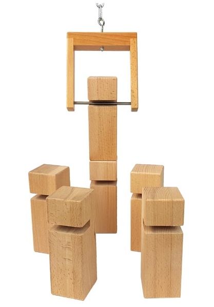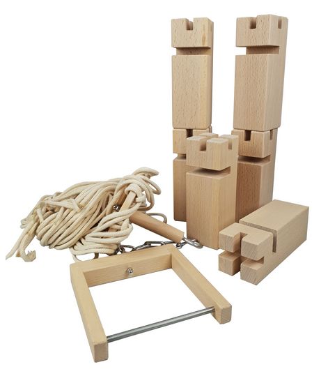 Inhalt: 6 Buchenholz-Klötze, 1 Bügel mit Metallstab, 1 Teller mit 16 Schnüren (je 2 m Länge)