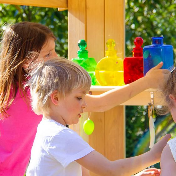 Die Matschküche ist mit einem praktischem Ablageregal für Behälter,