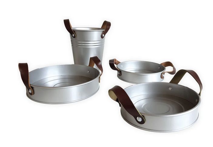 den 4 Edelstahlhaken hängen Blumen, Kochlöffel, Schneebesen, Siebe,