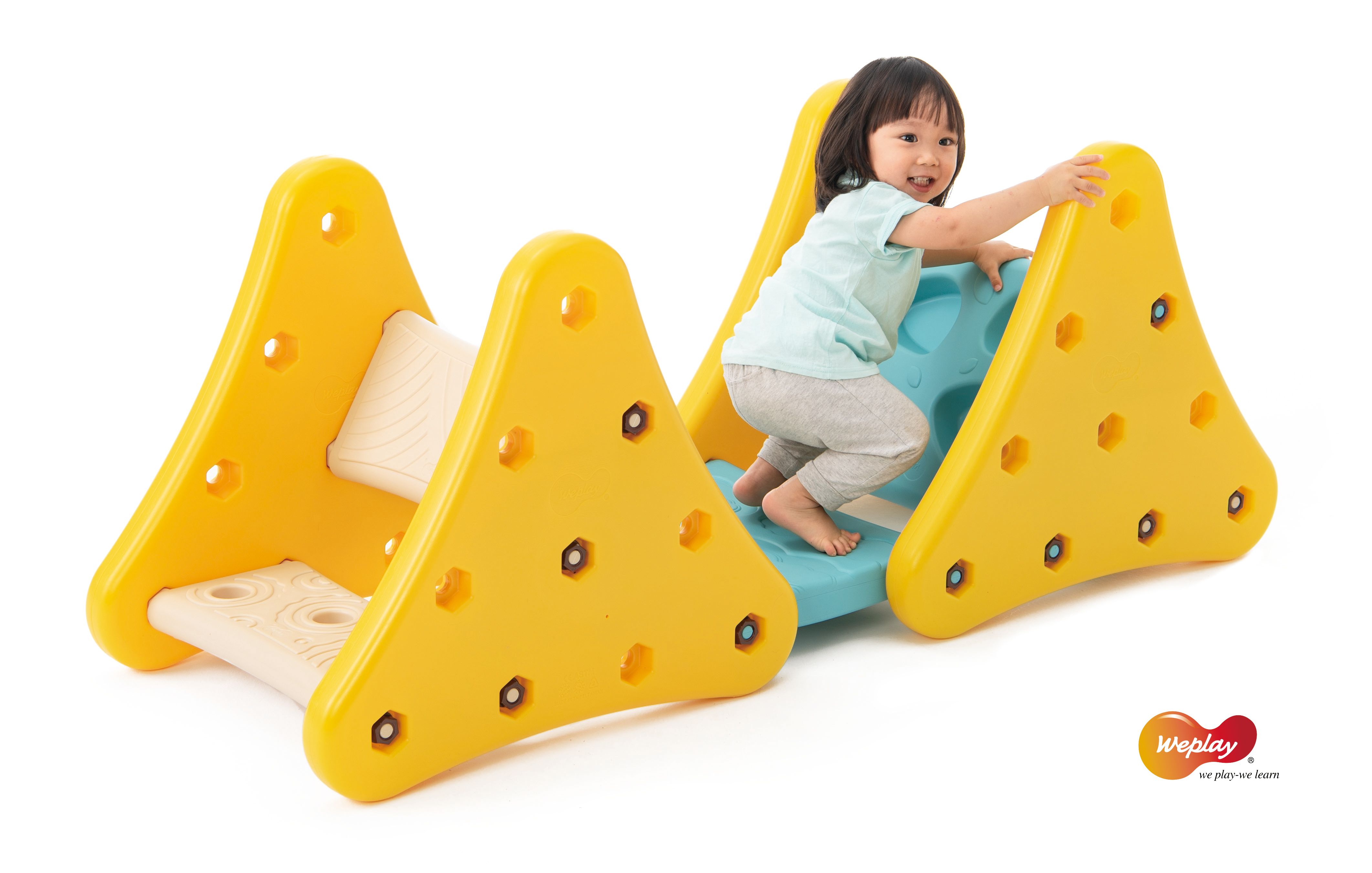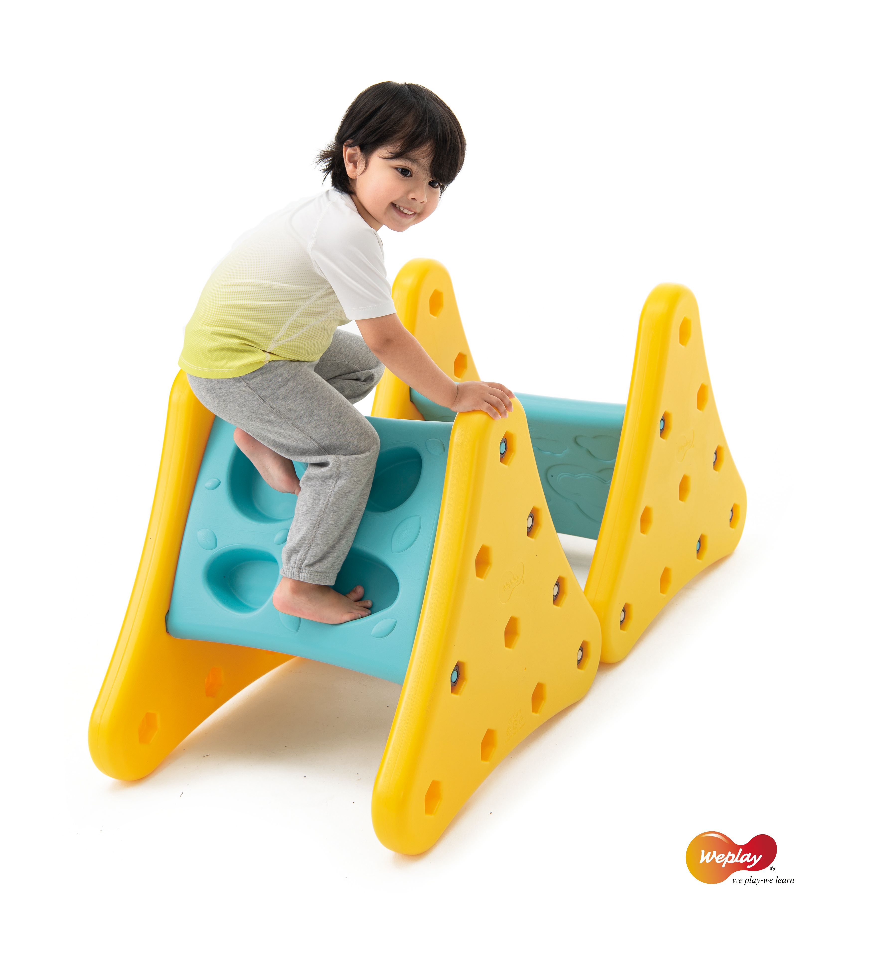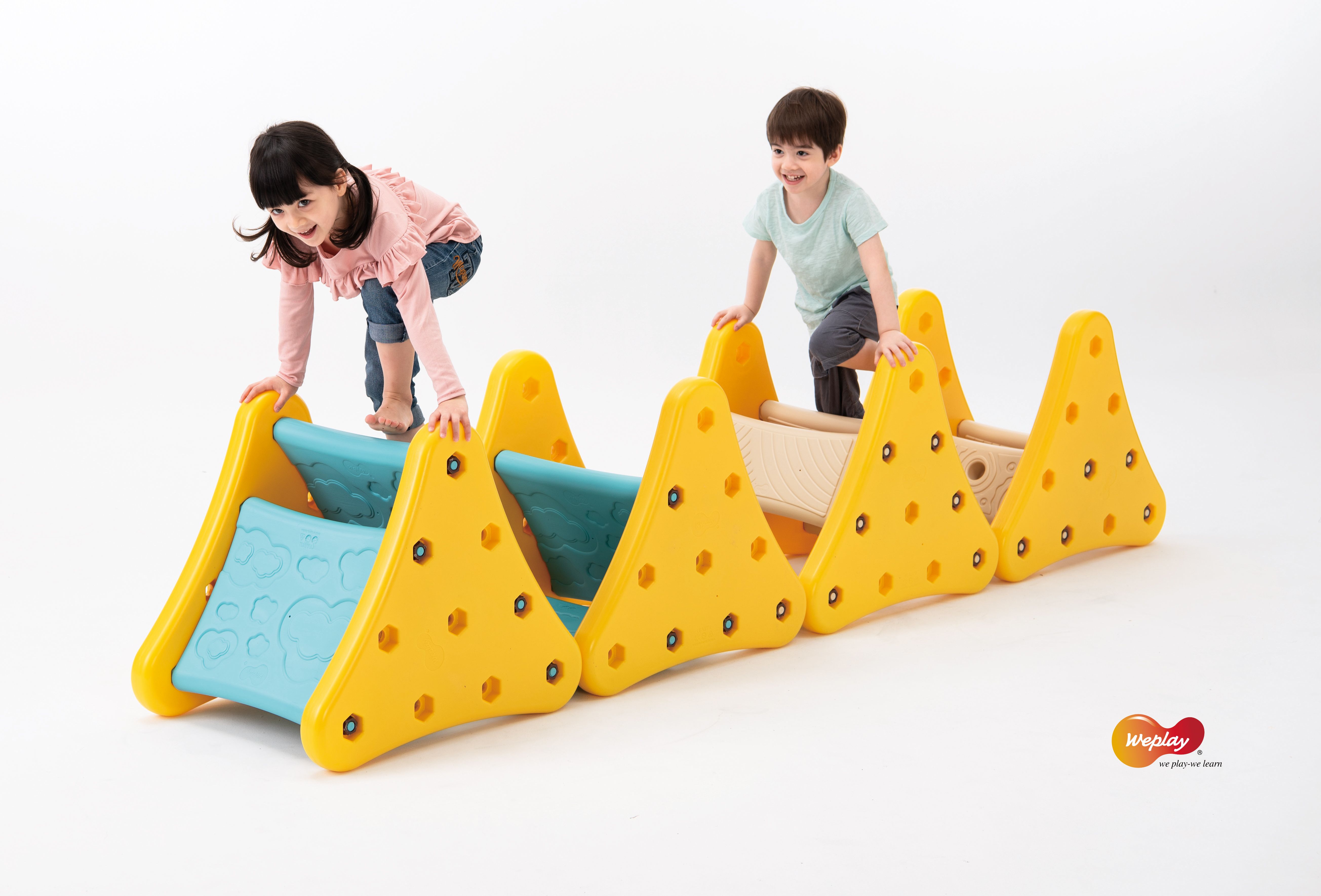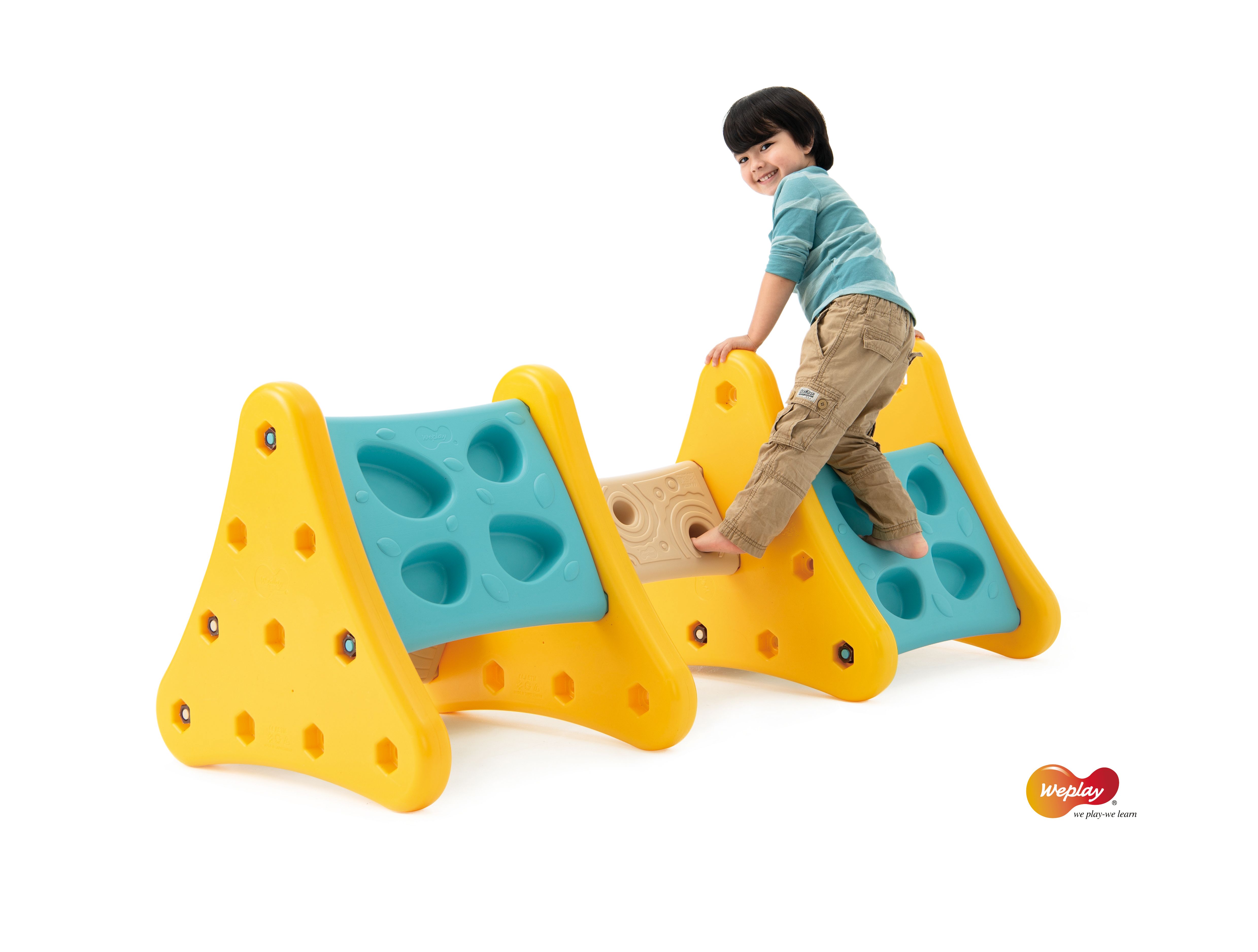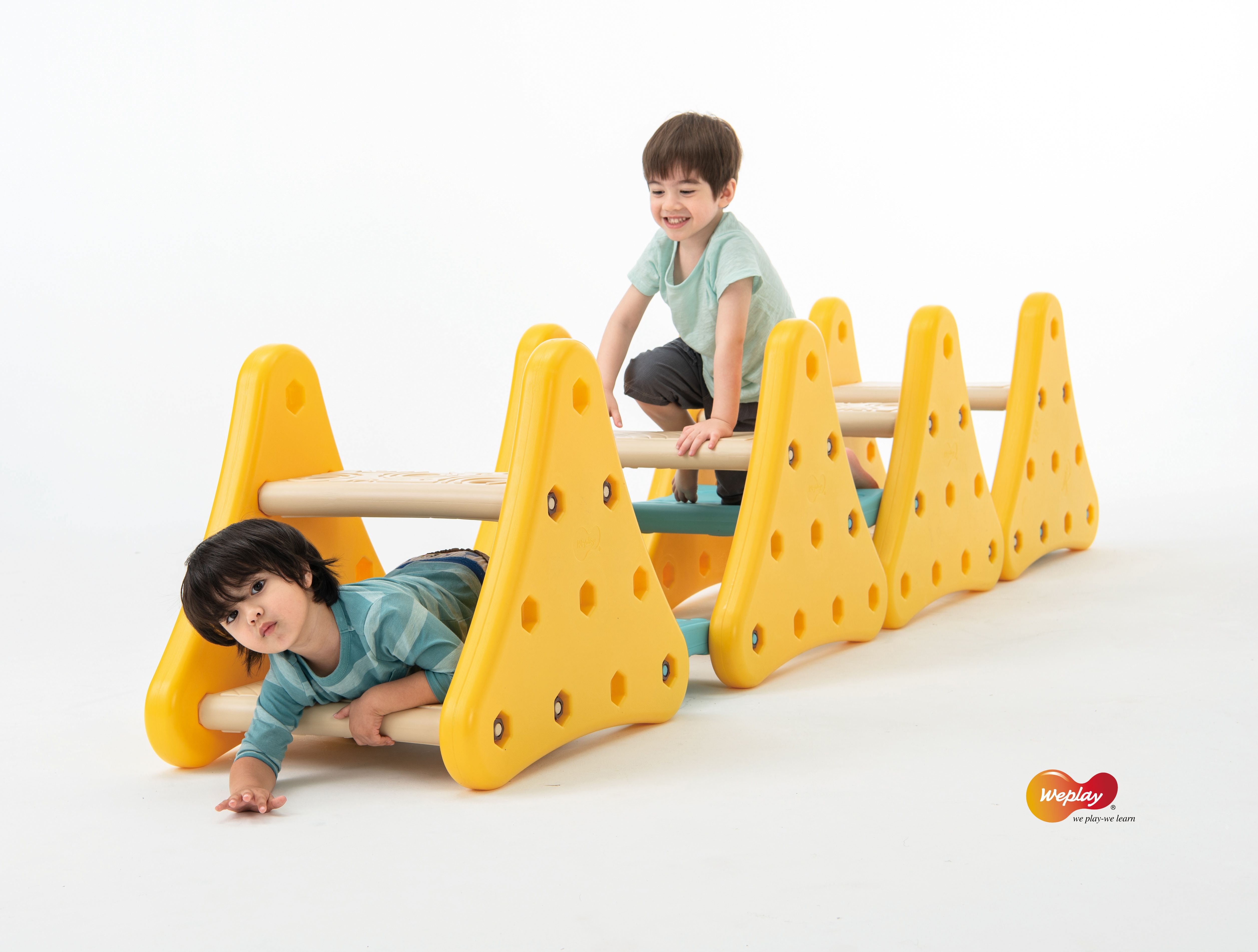 Vertiefungen in den breiten und schmalen Brettern geben den Kindern Halt beim Klettern mit Händen