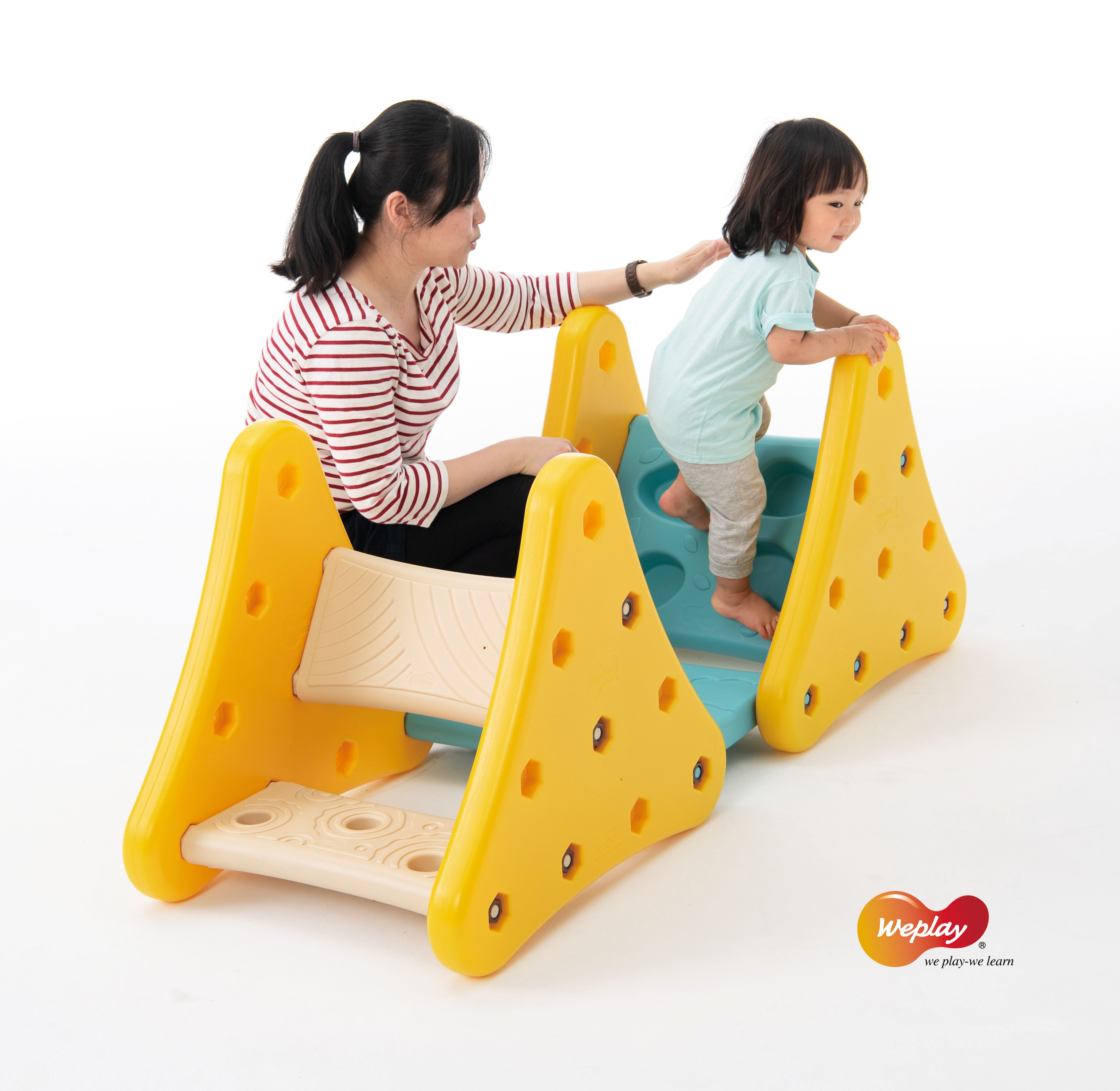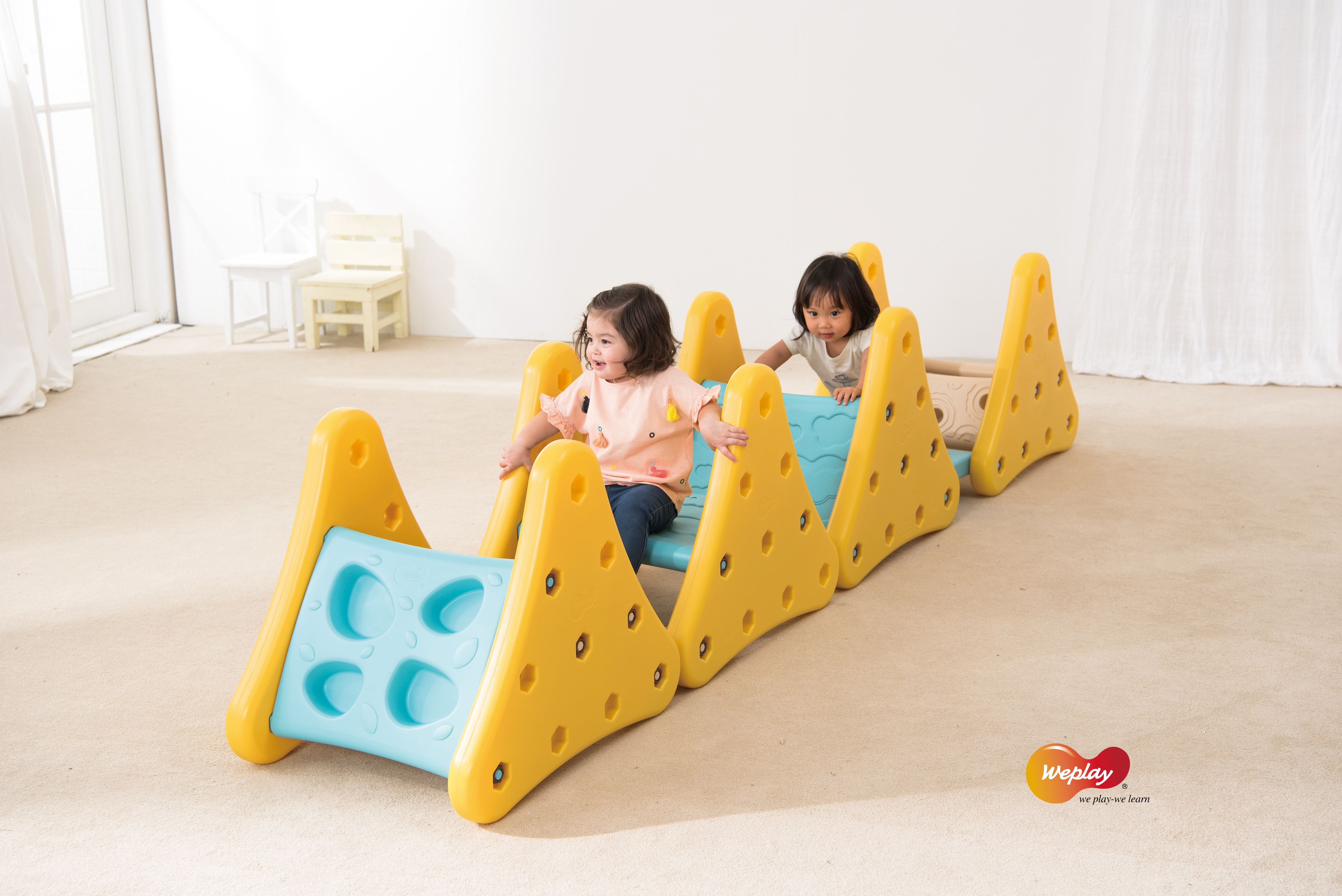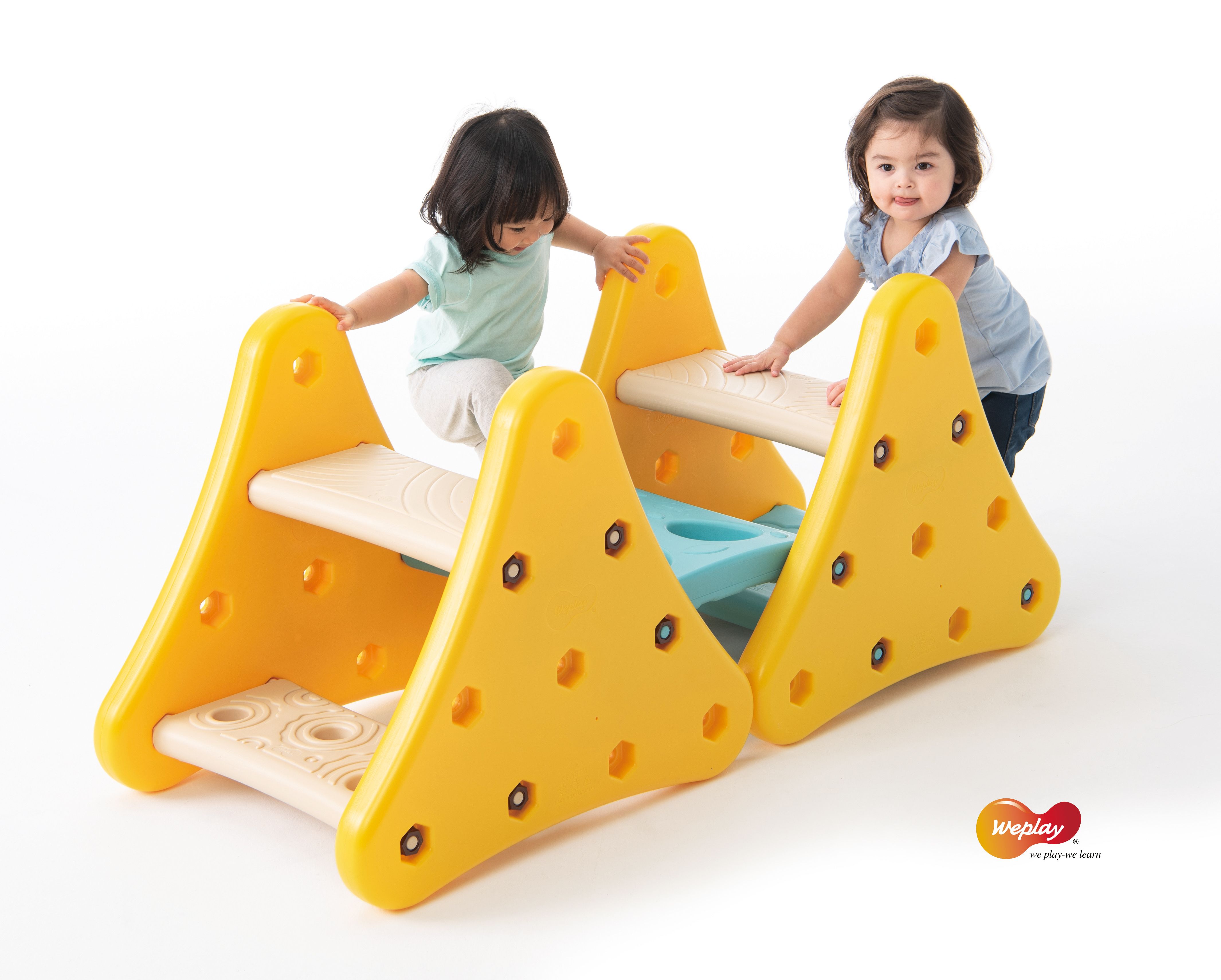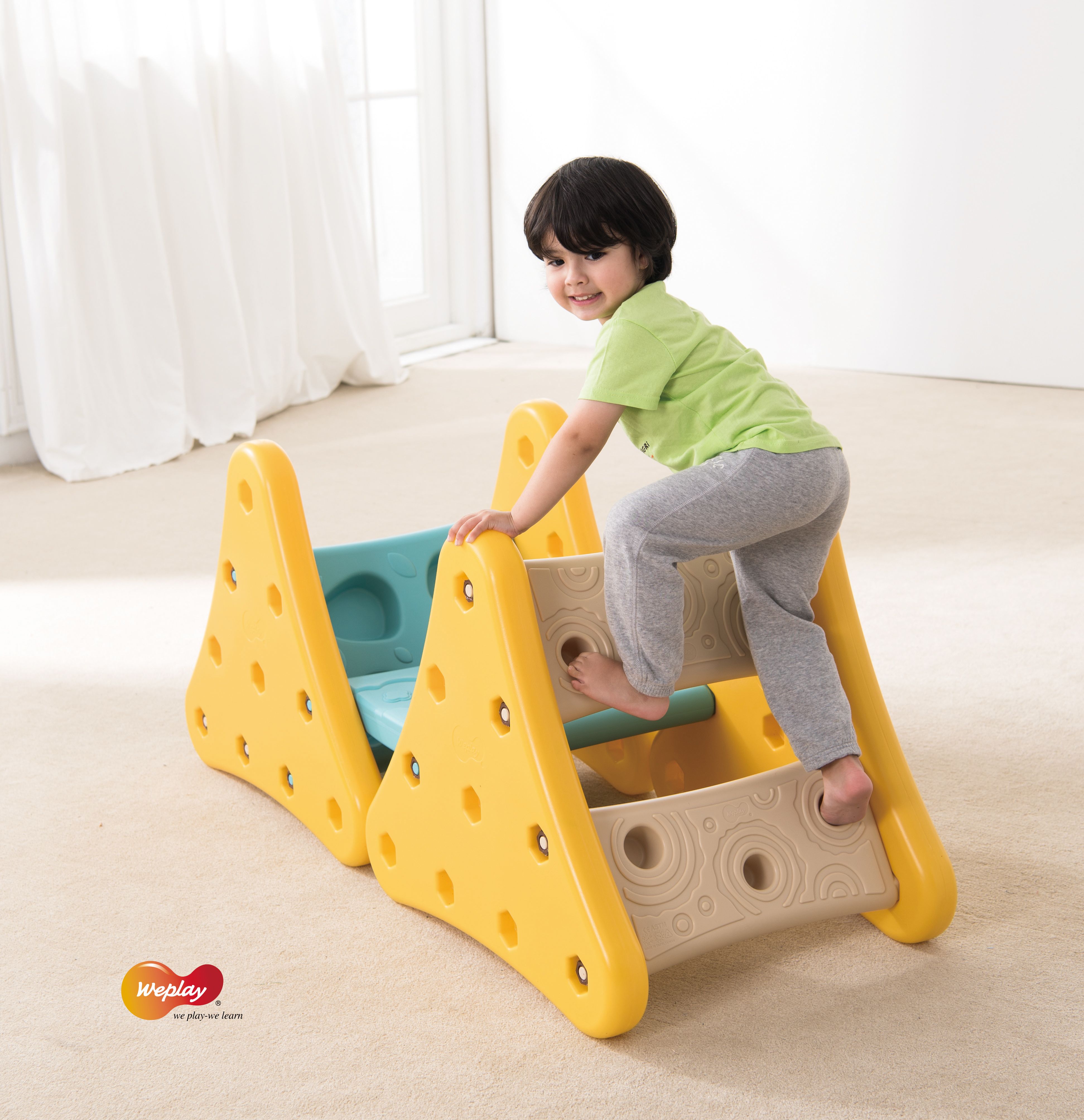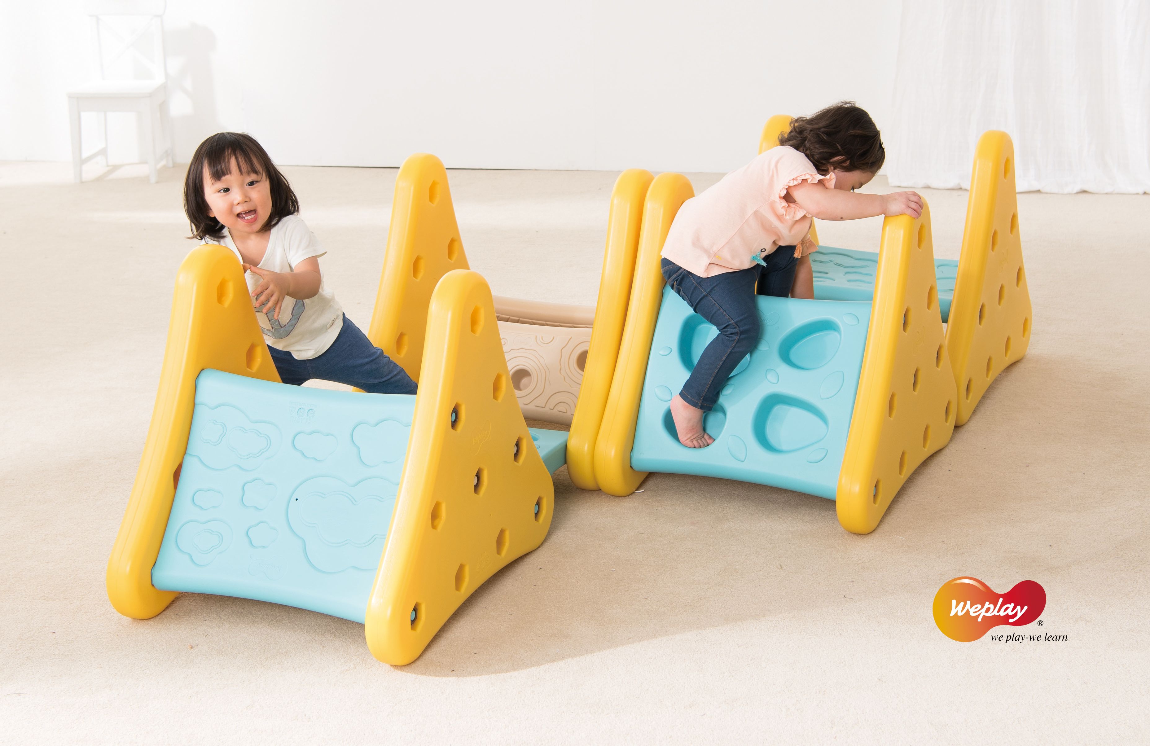 Vertiefungen in den breiten und schmalen Brettern geben den Kindern Halt beim Klettern mit Händen