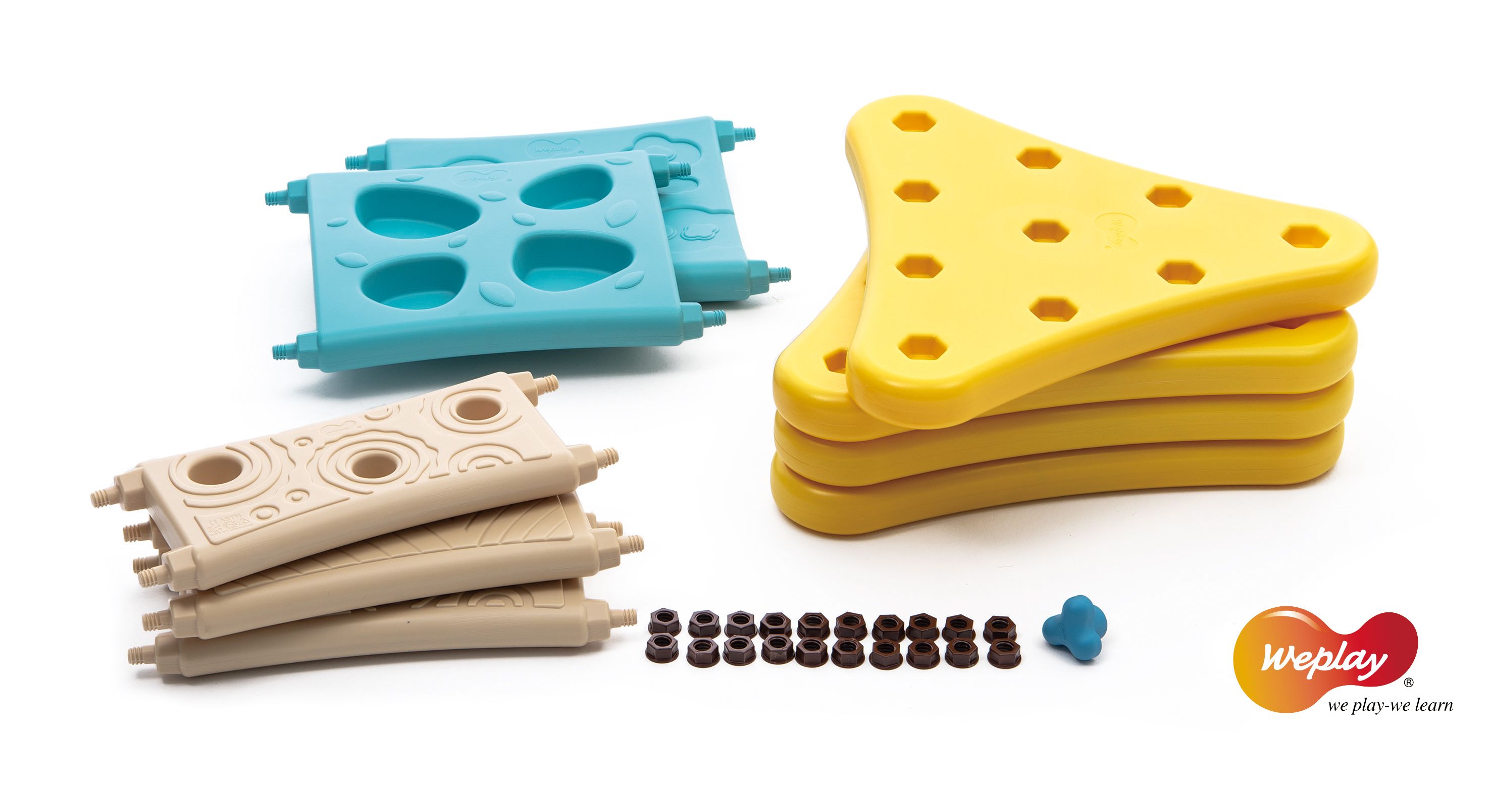 Inhalt: 4 x Dreieck (gelb), 3 x breites Brett (türkis), 2 x schmales Brett (ocker), 20 x Schraubenmutter,