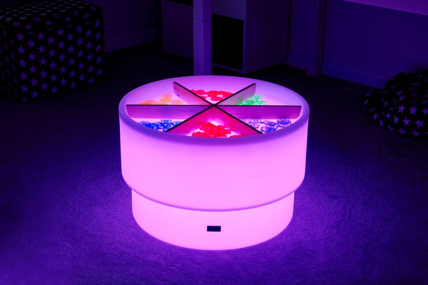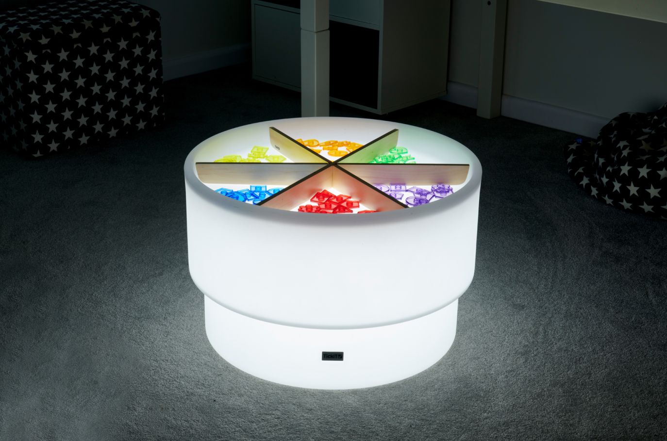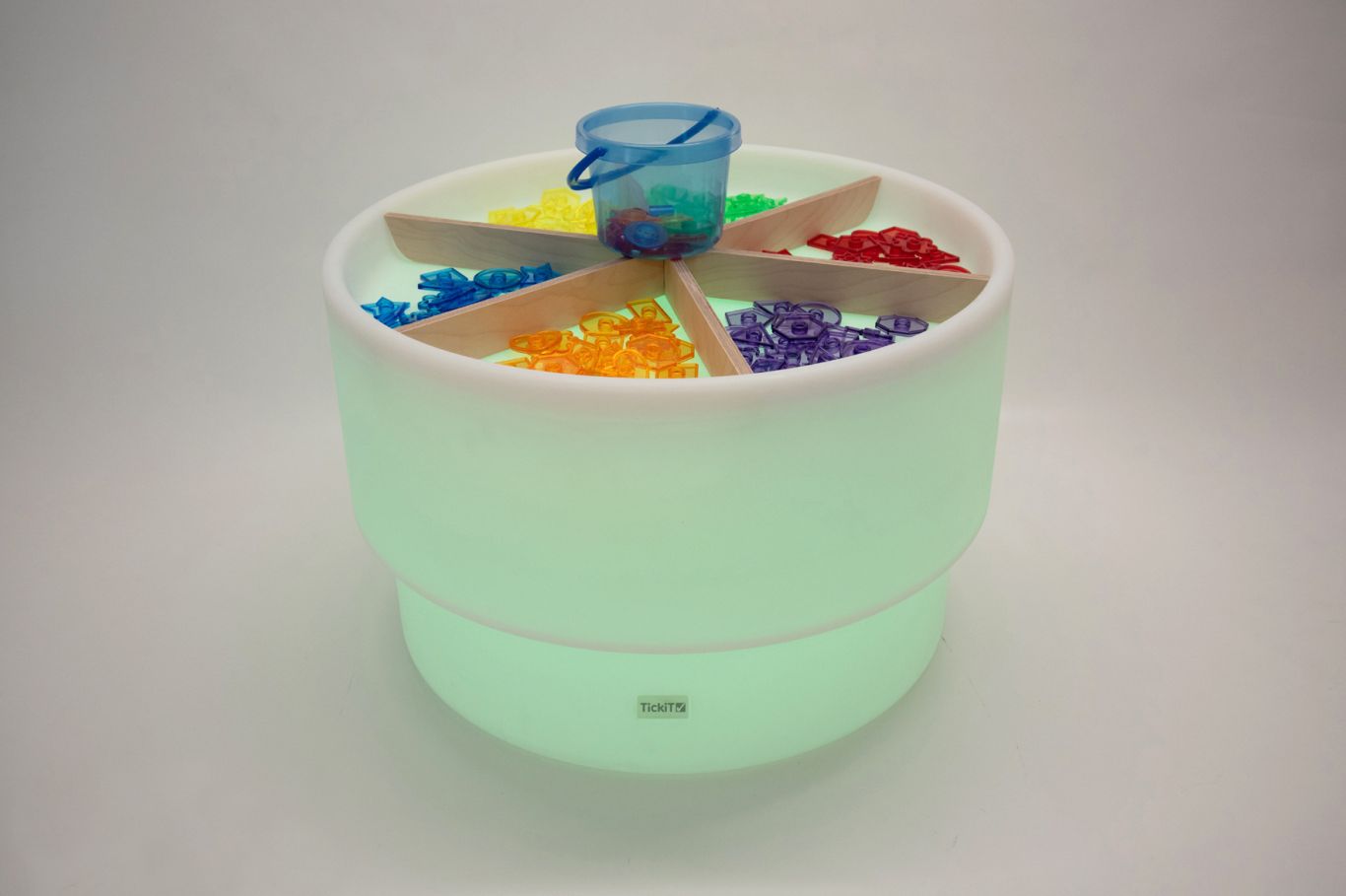 Auf dem runden Leuchttisch mit erhöhtem Rand können Kinder drinnen wie draußen