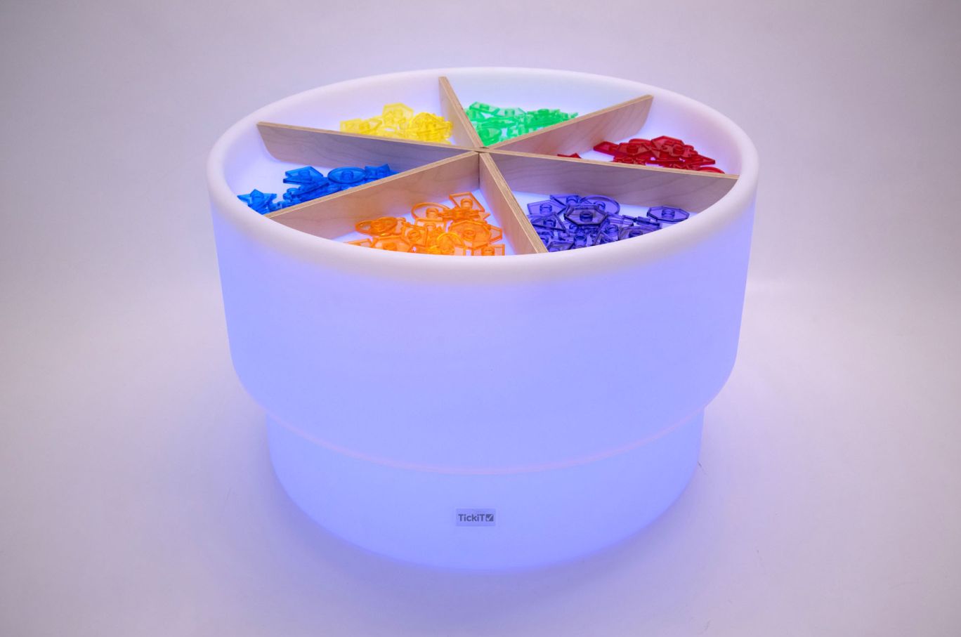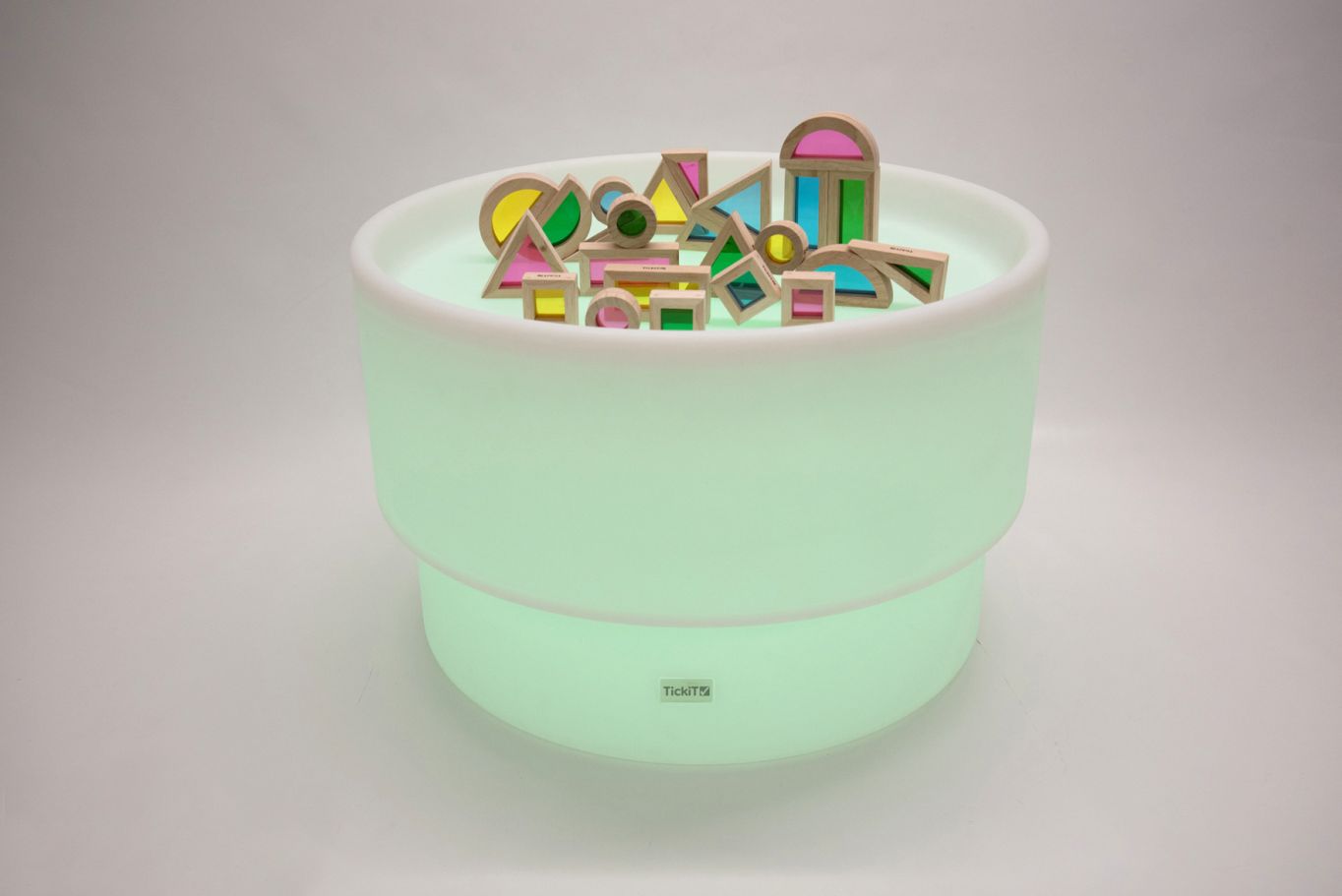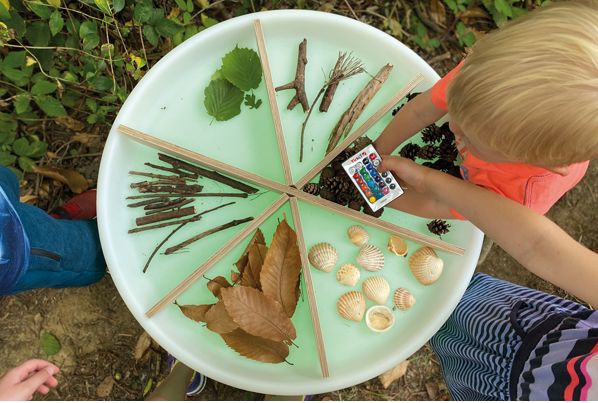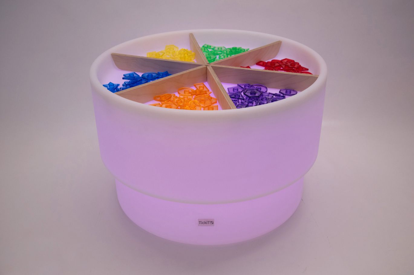 Auf dem runden Leuchttisch mit erhöhtem Rand können Kinder drinnen wie draußen