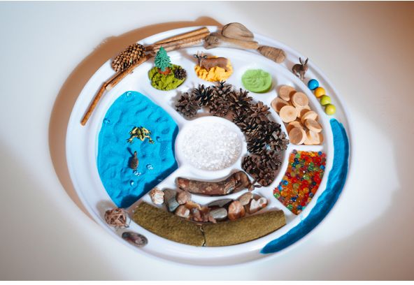 hat außen einen Rand mit vier Vertiefungen als Ablage für weitere Sensorikmaterialien.
