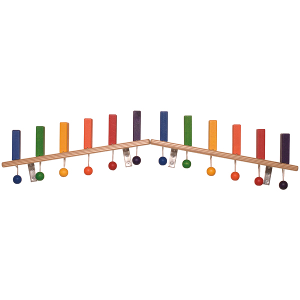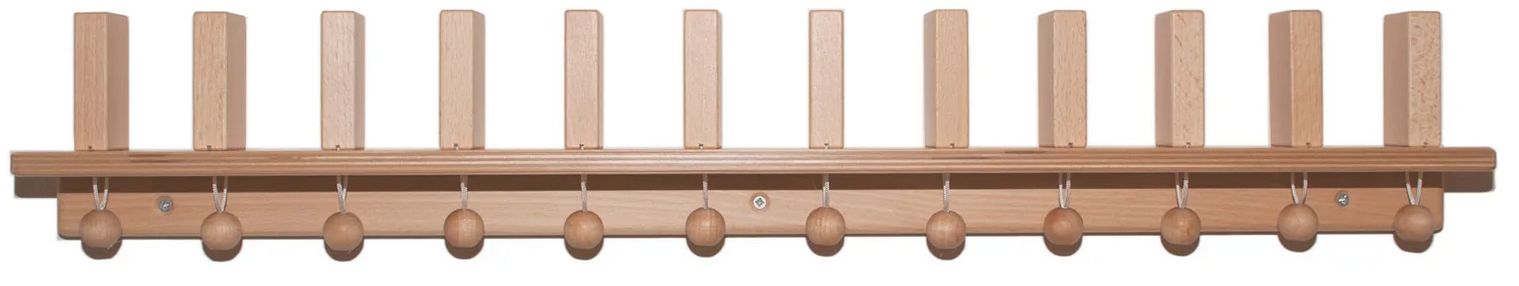 sind mit kleinen Bändern und Kugeln an einer Holzleiste sicher befestigt.
